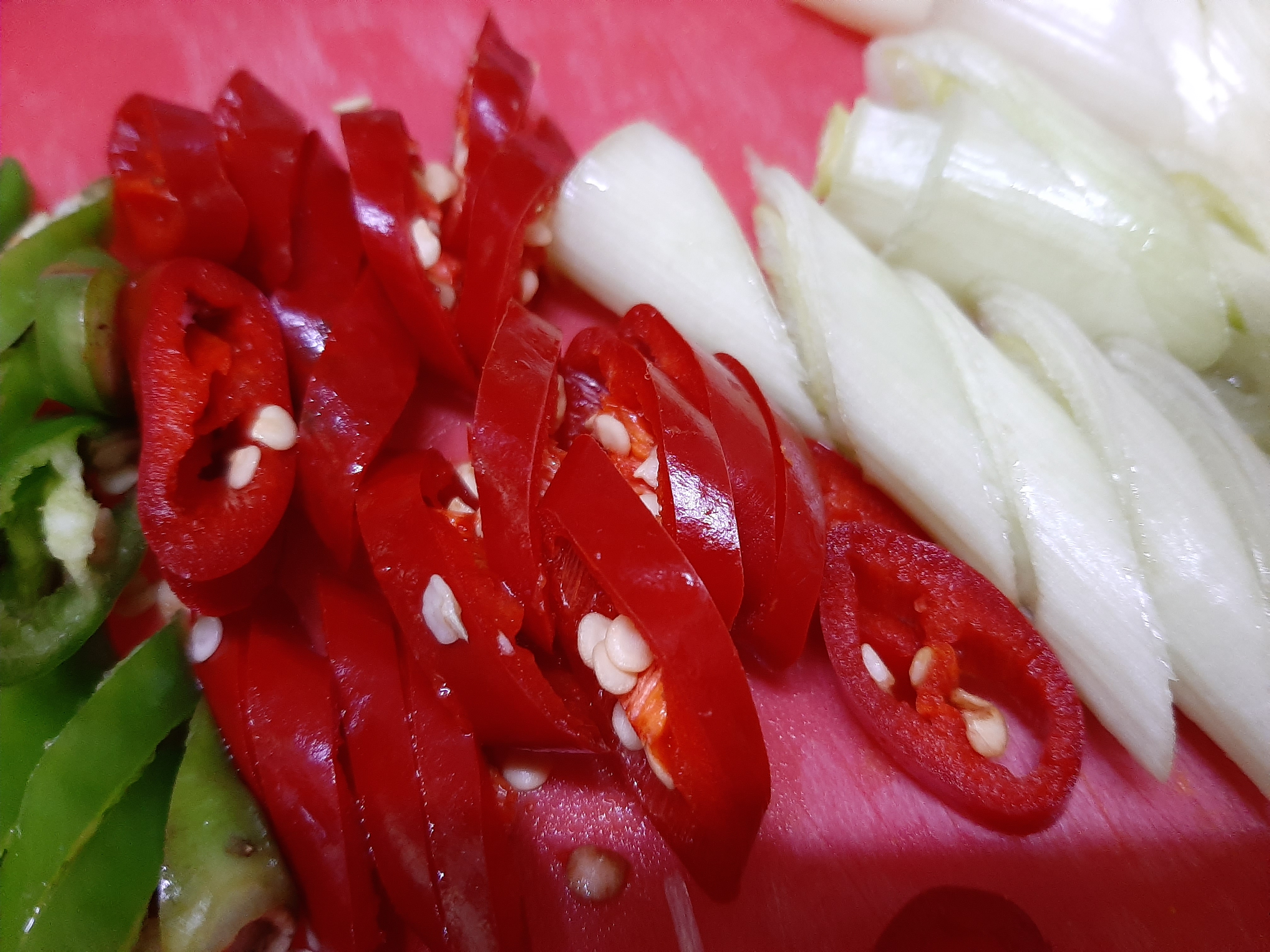 2. 청양고추, 홍고추, 대파는 어슷 썬다.