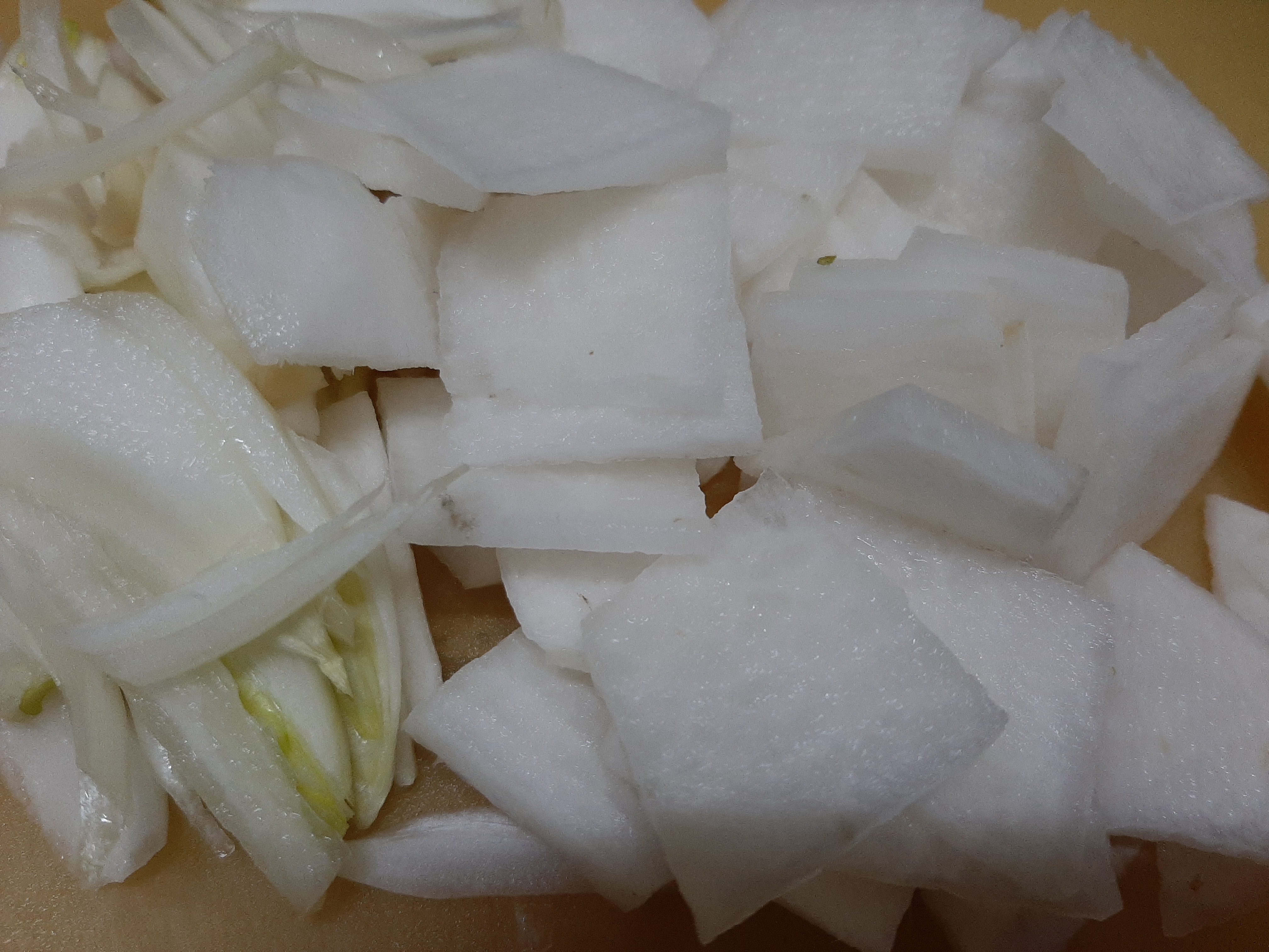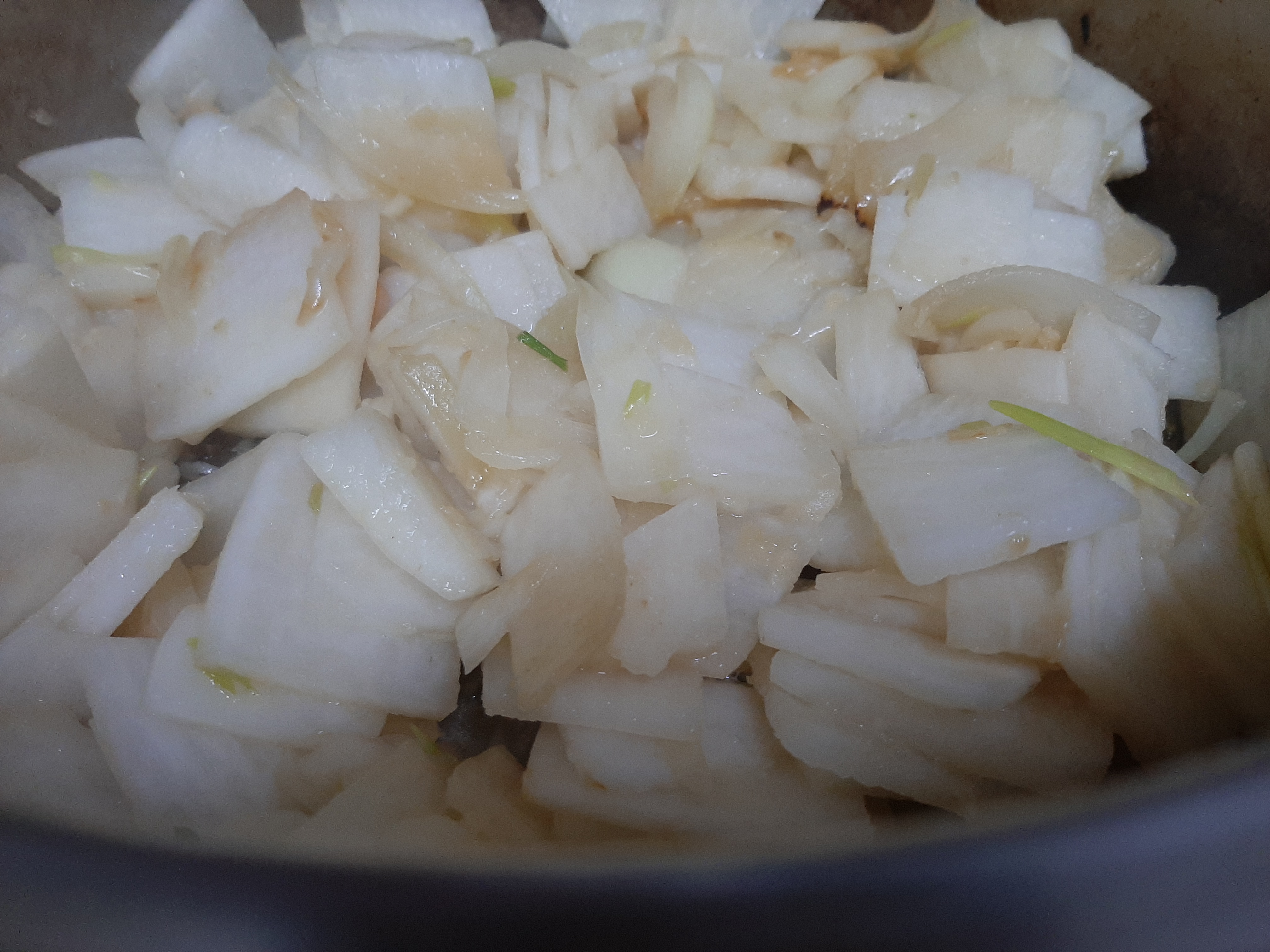 4. 무쇠냄비에 얇게 썬 무, 양파를 깔고