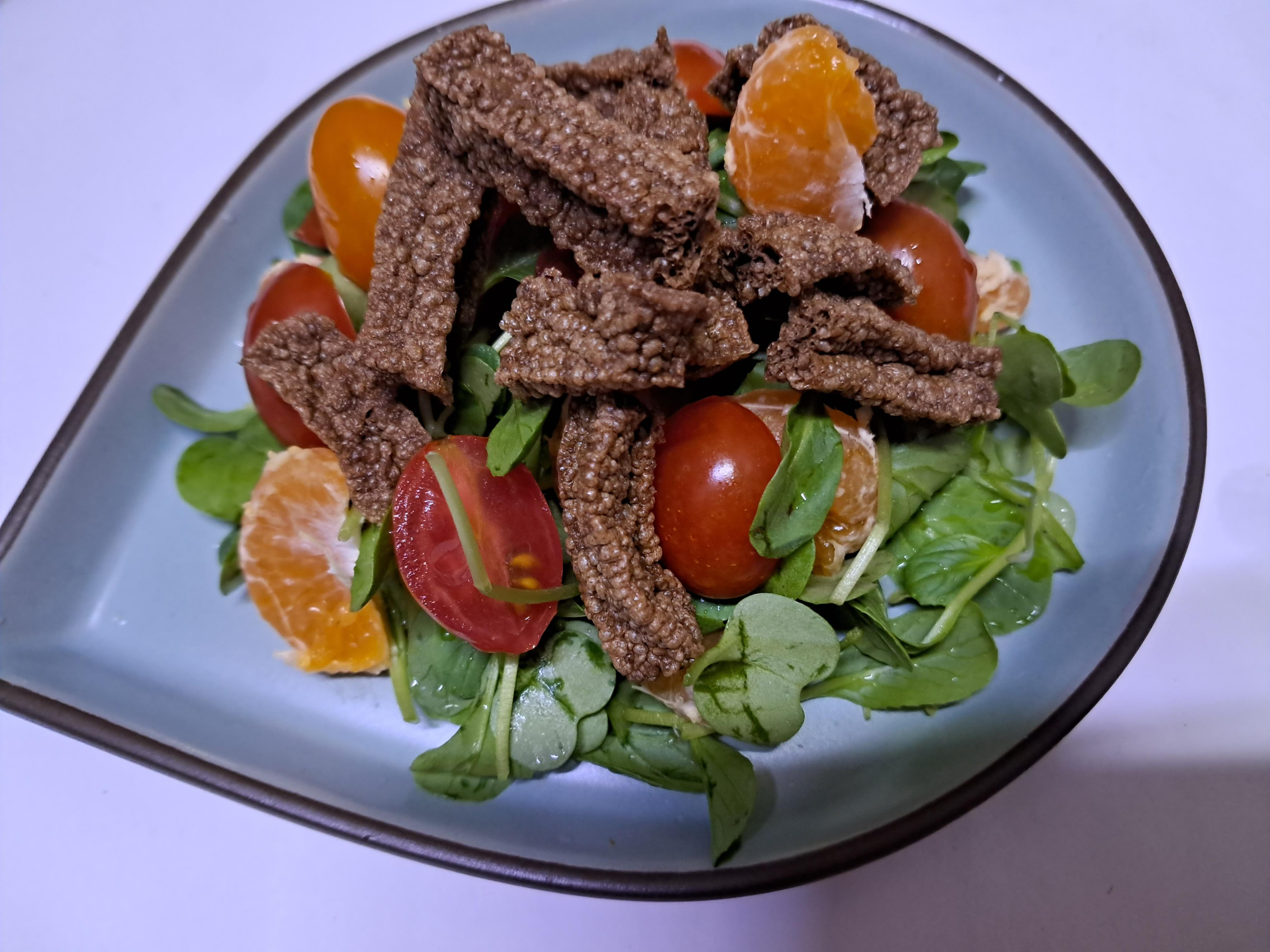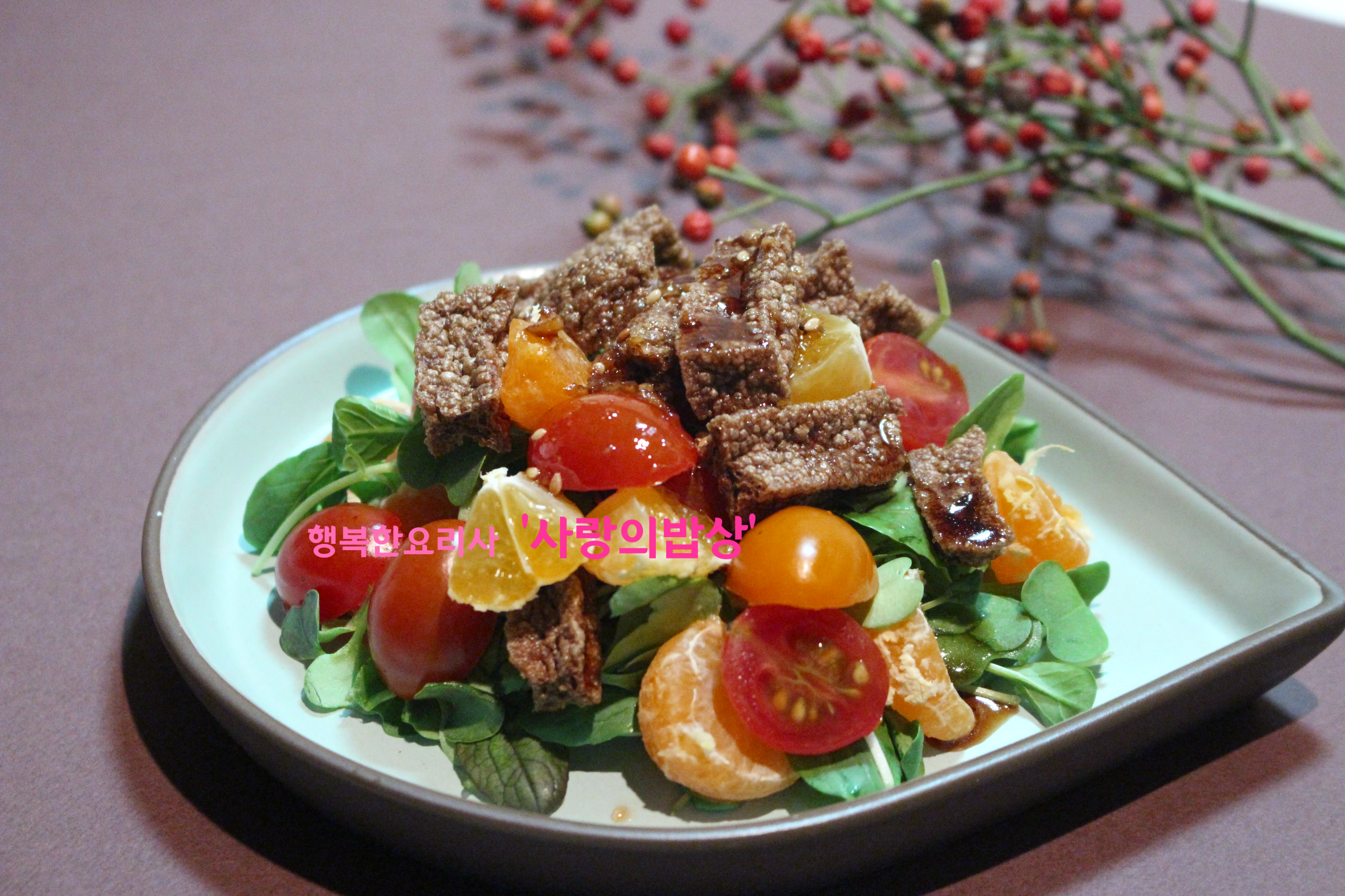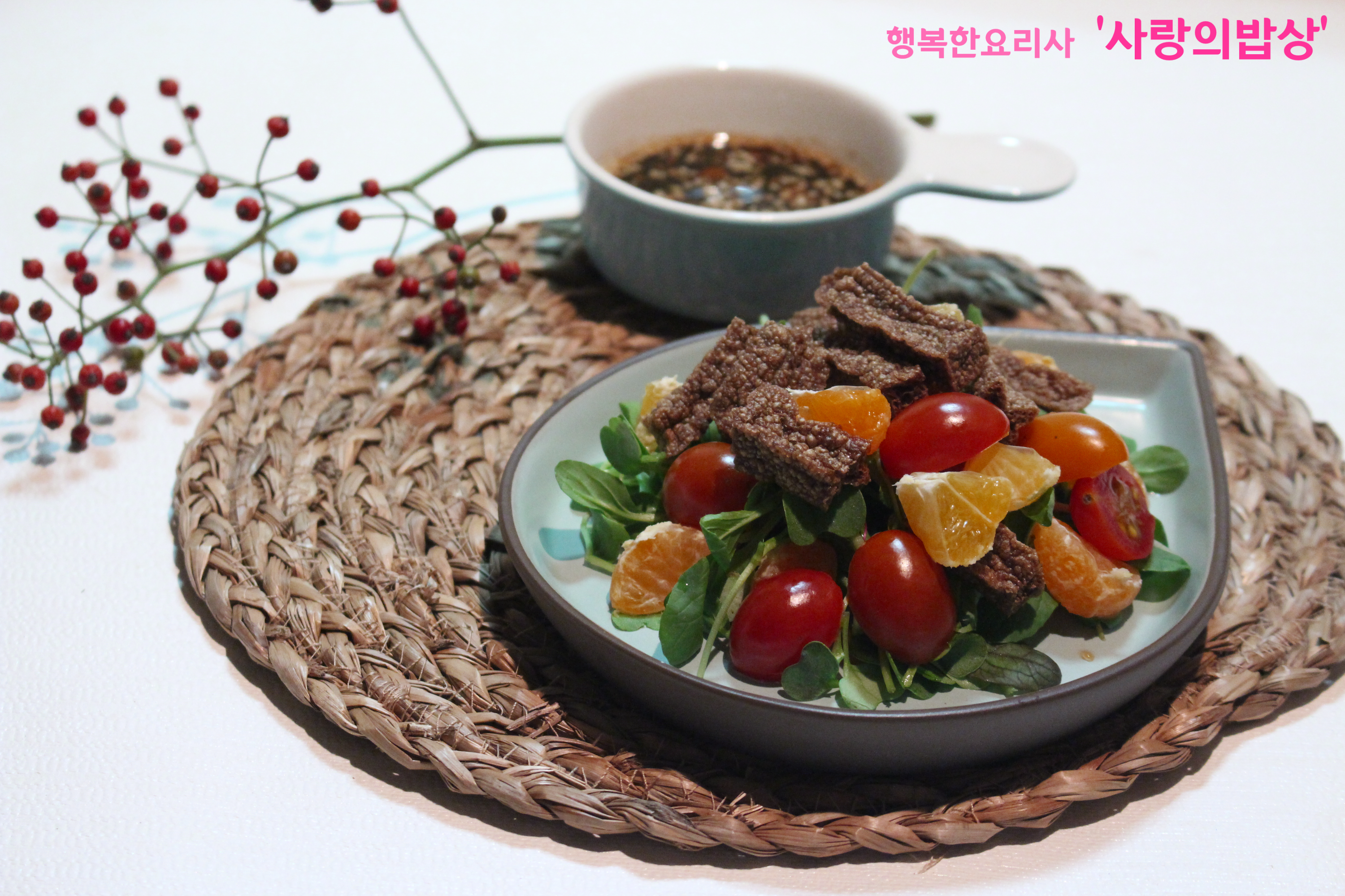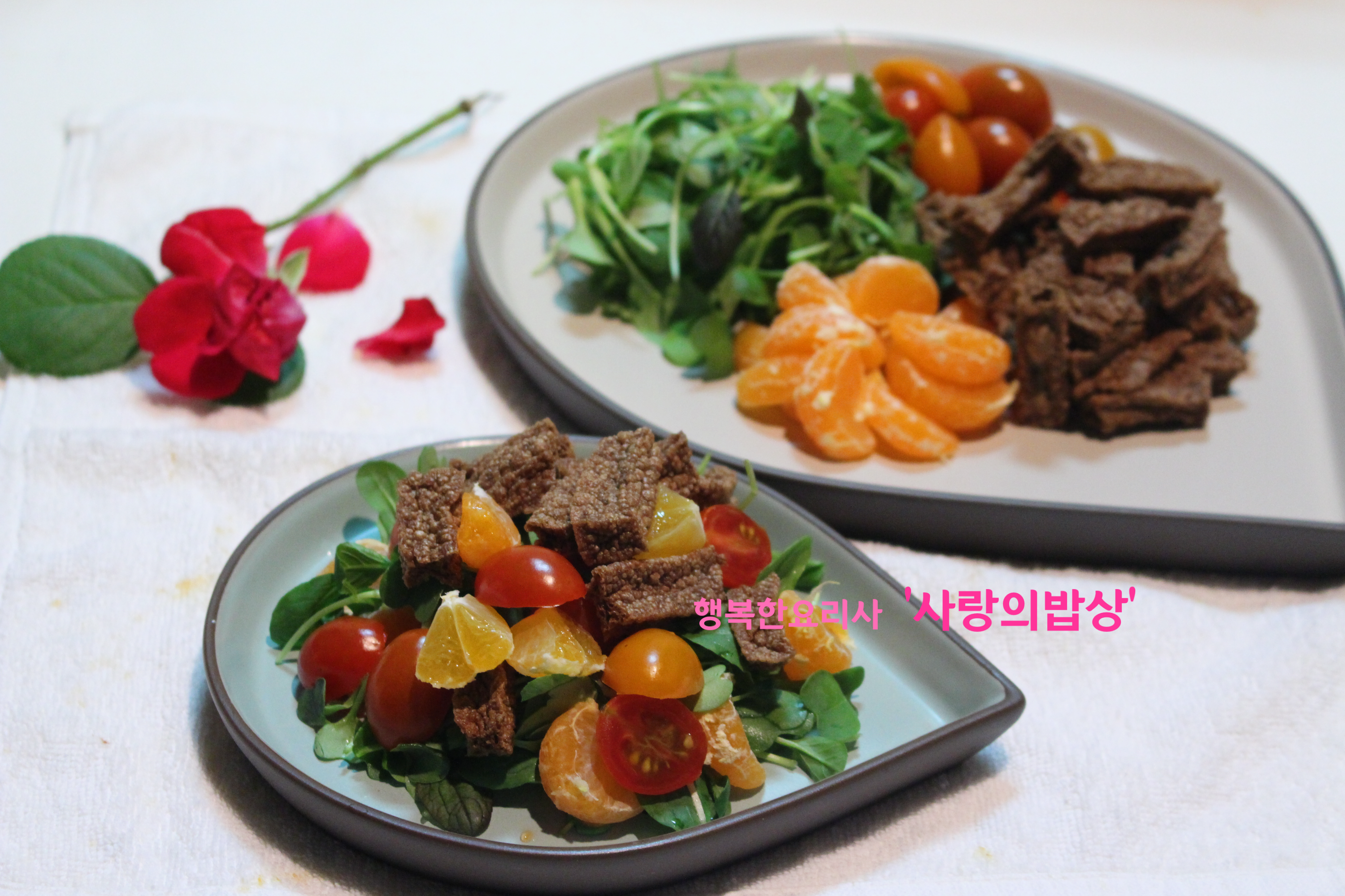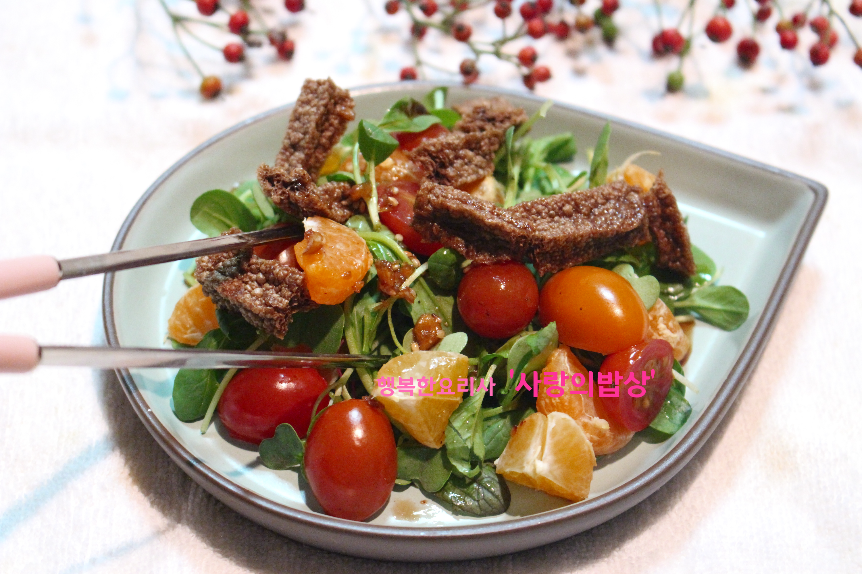 3. 접시에 튀긴 도토리묵, 어린잎채소, 방울토마토,