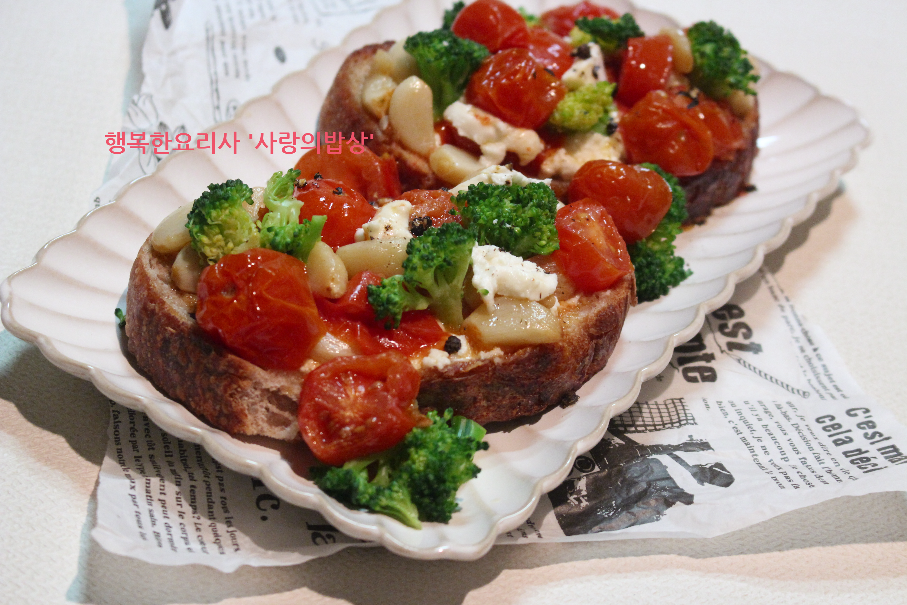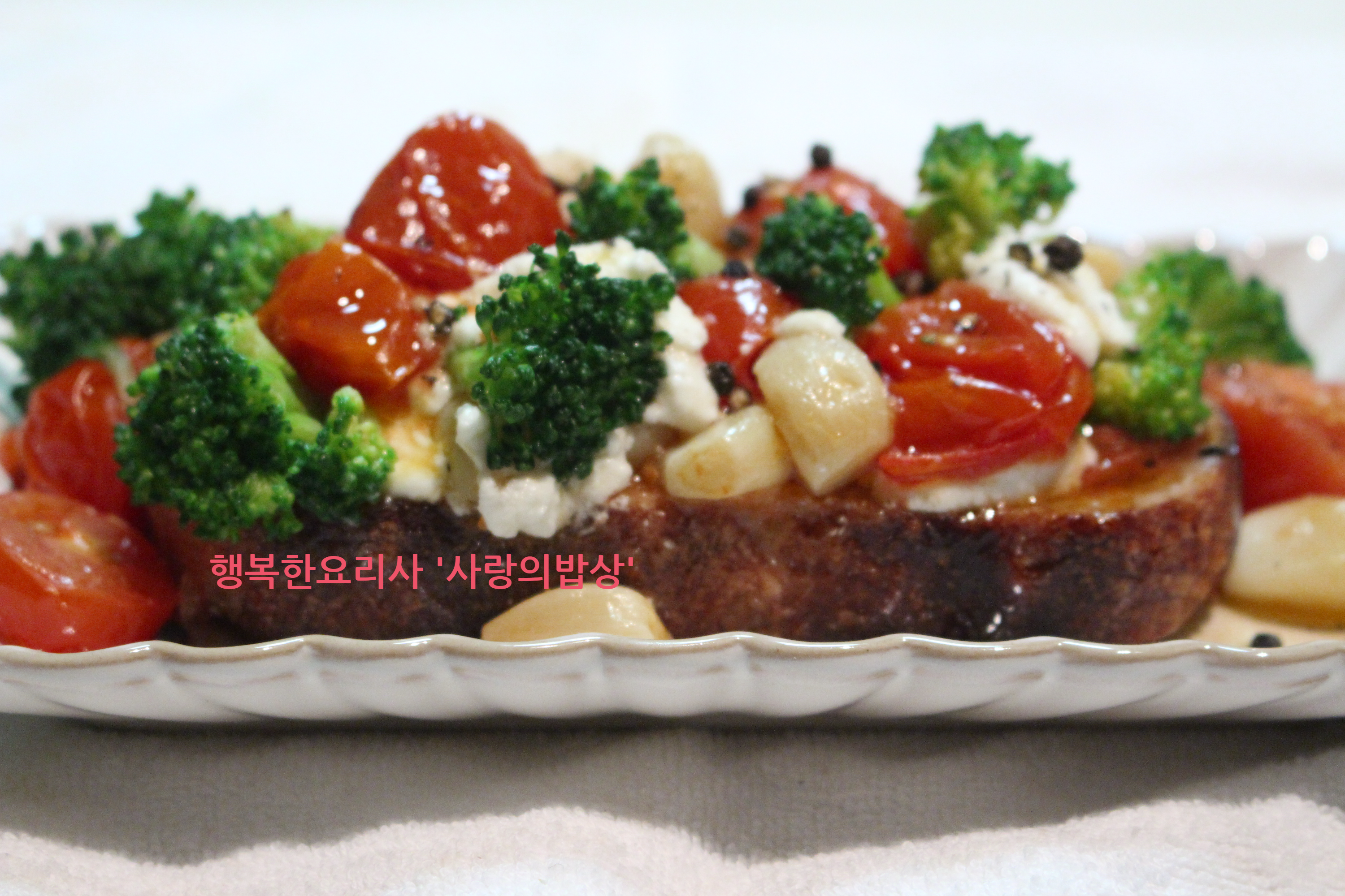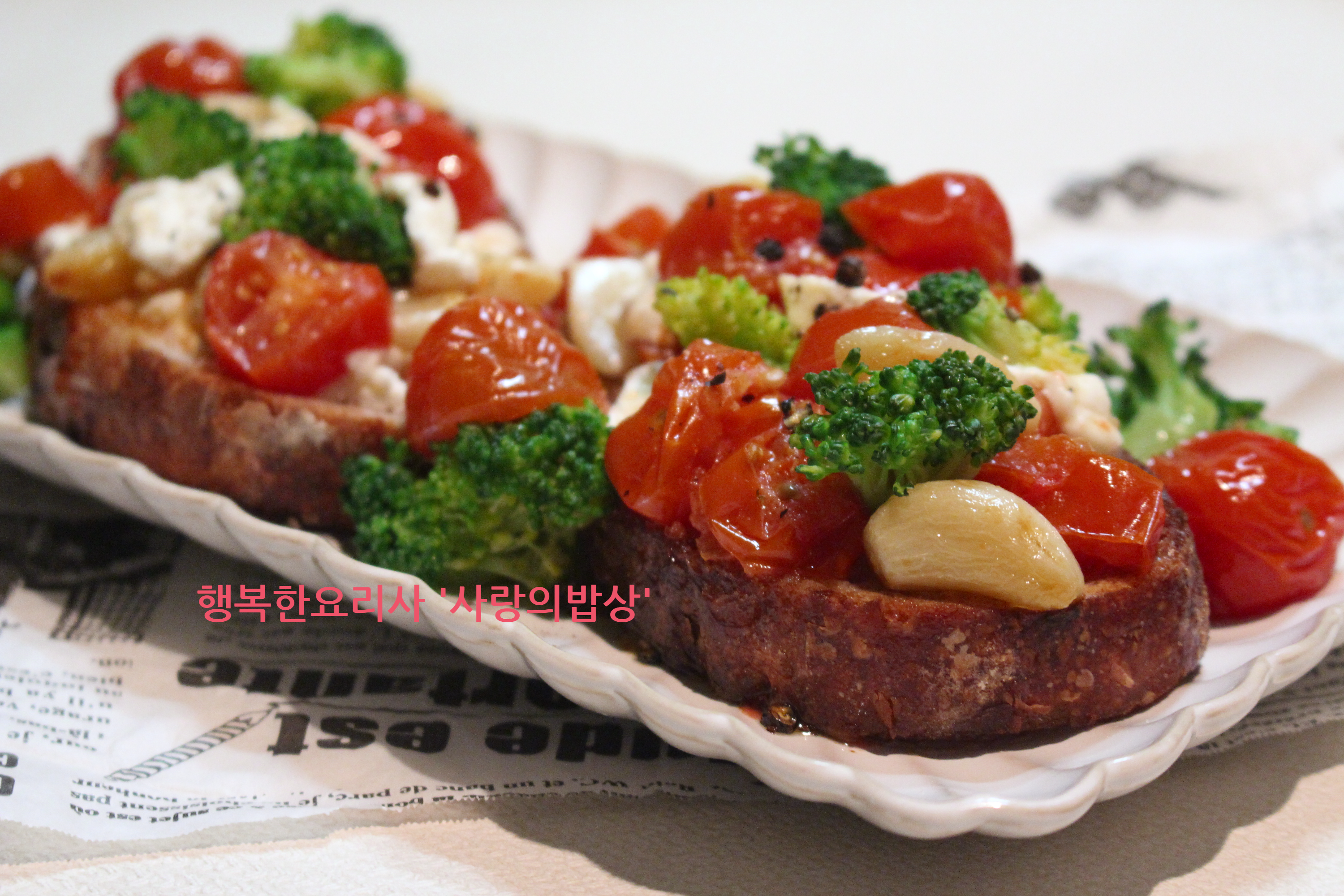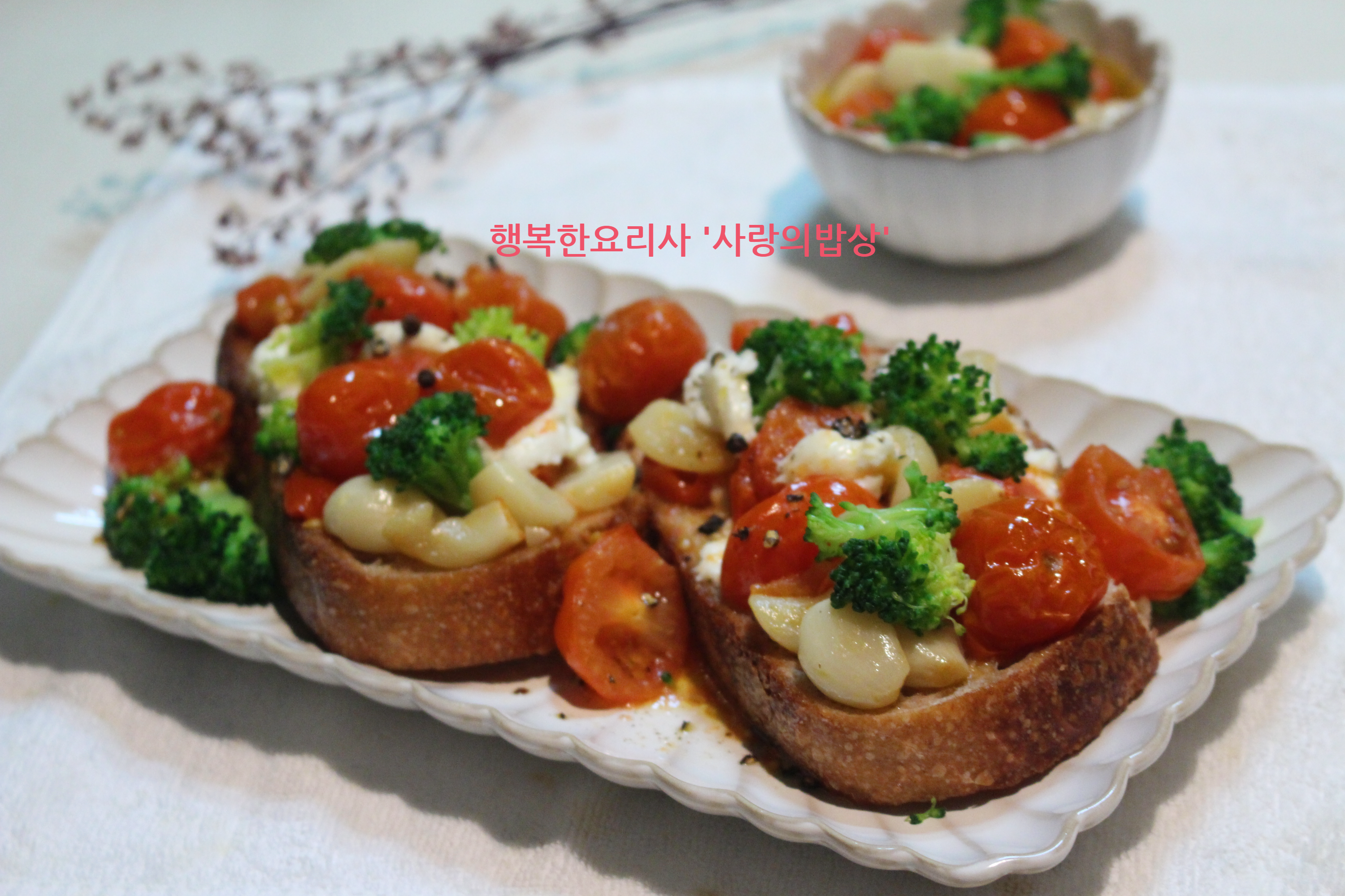 7. 6의 빵 위에 토마토, 마늘, 브로콜리를 올리고