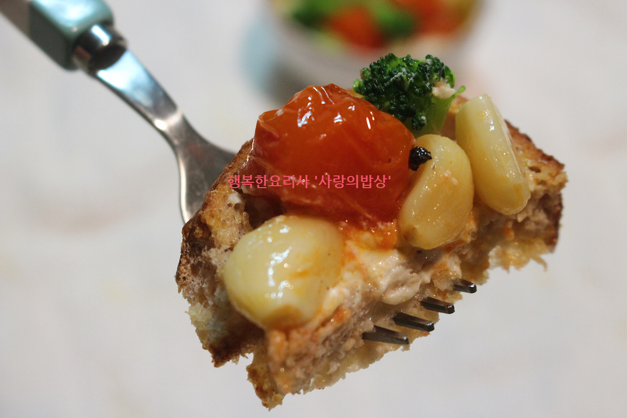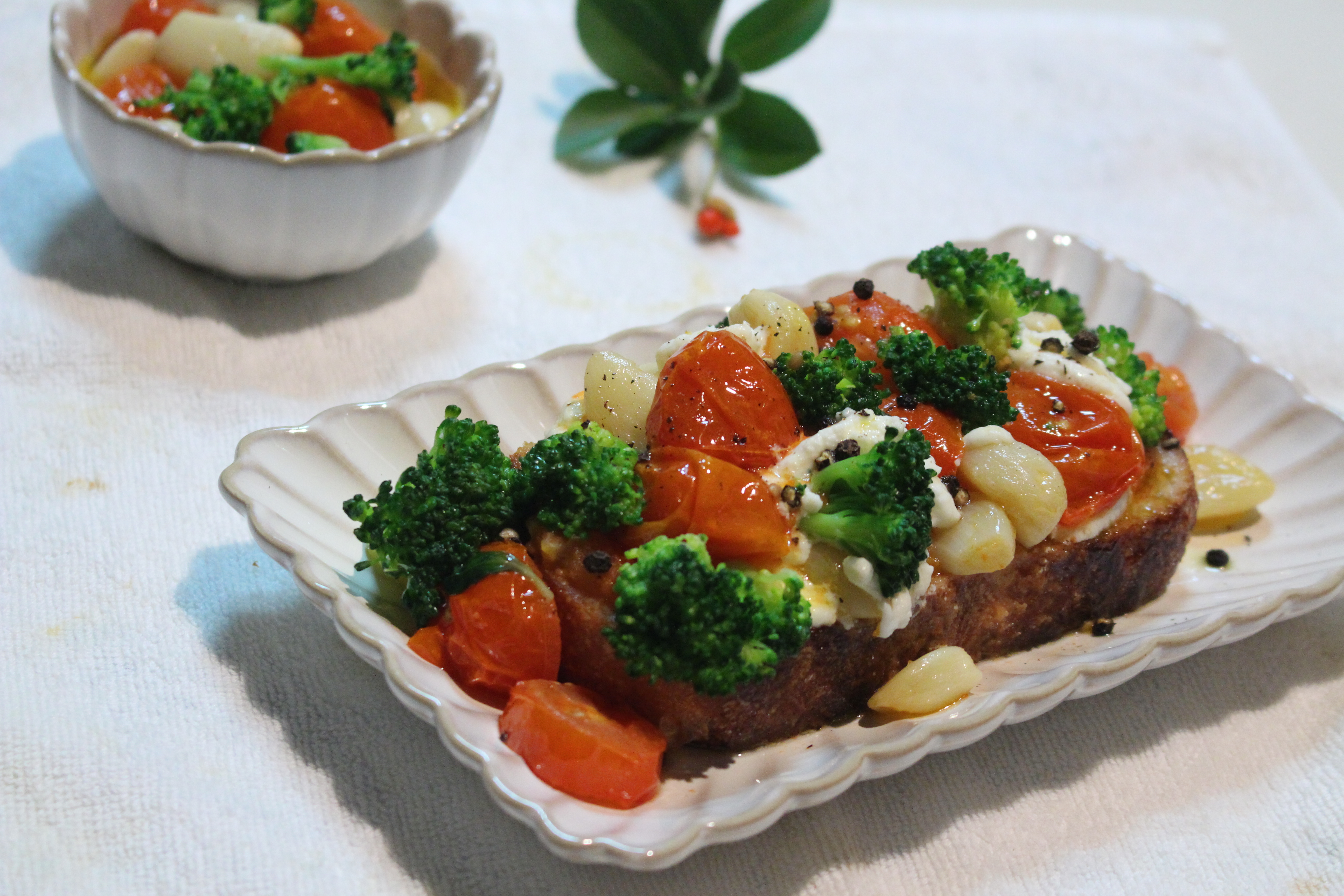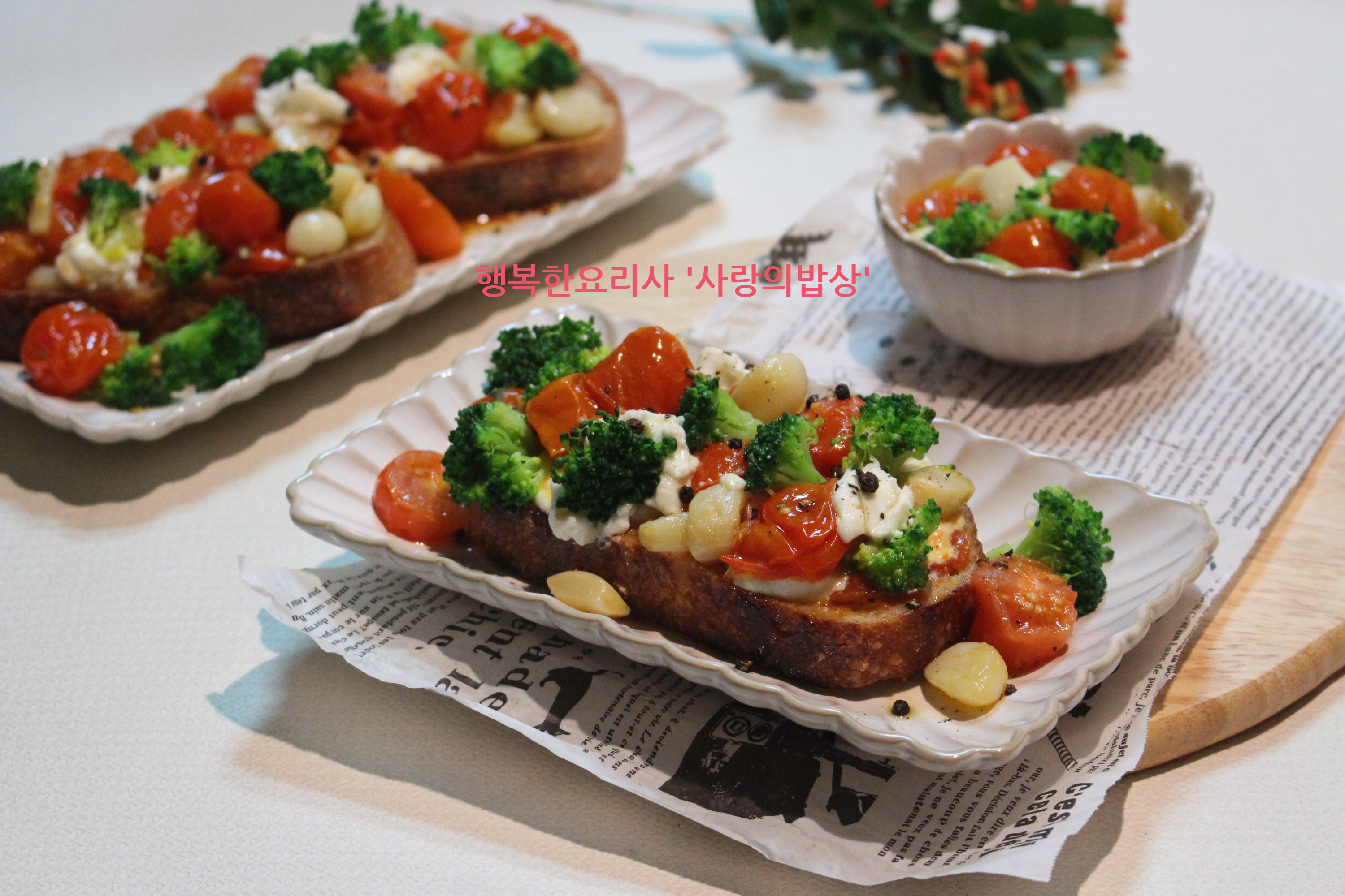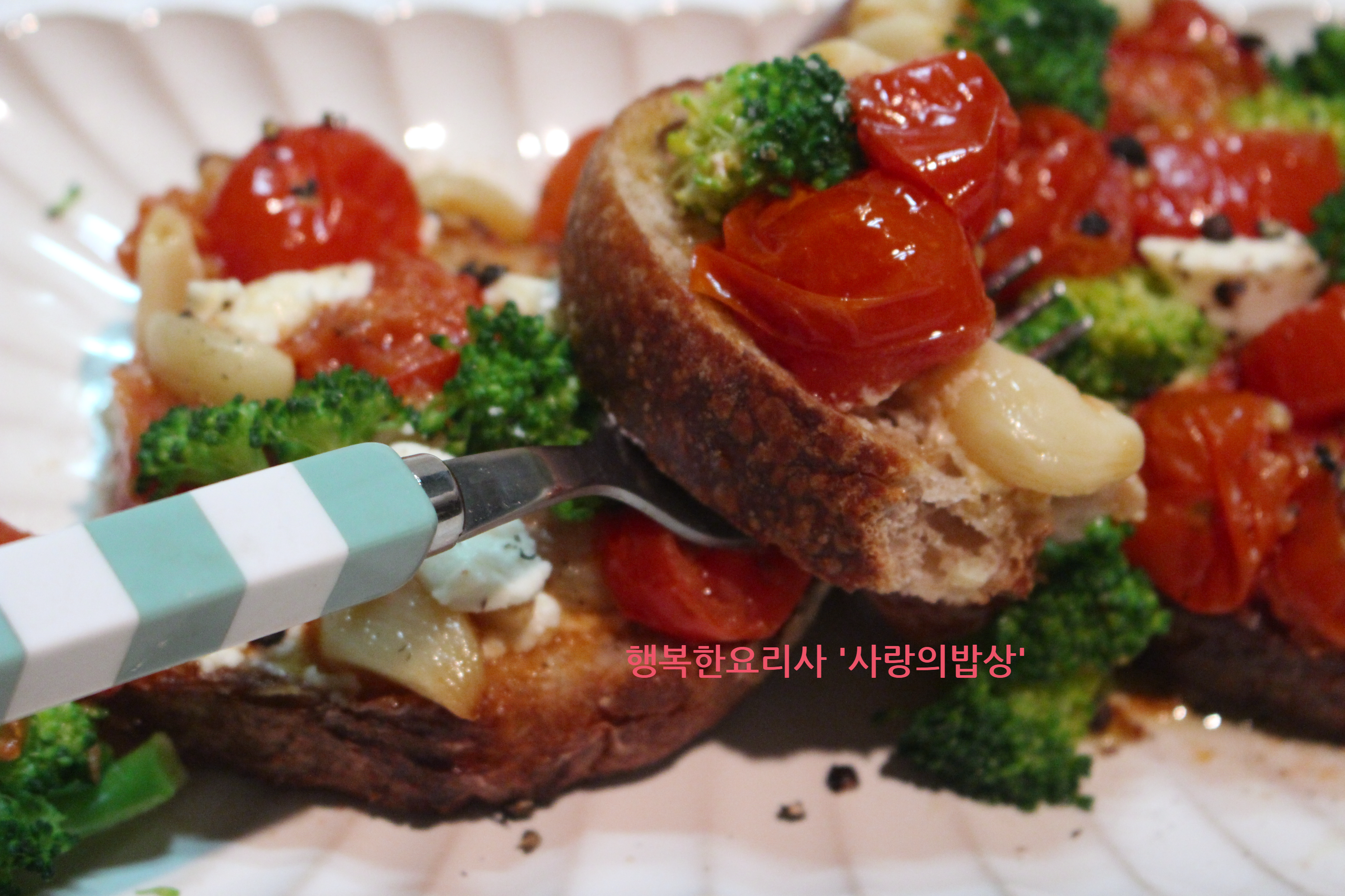 7. 6의 빵 위에 토마토, 마늘, 브로콜리를 올리고