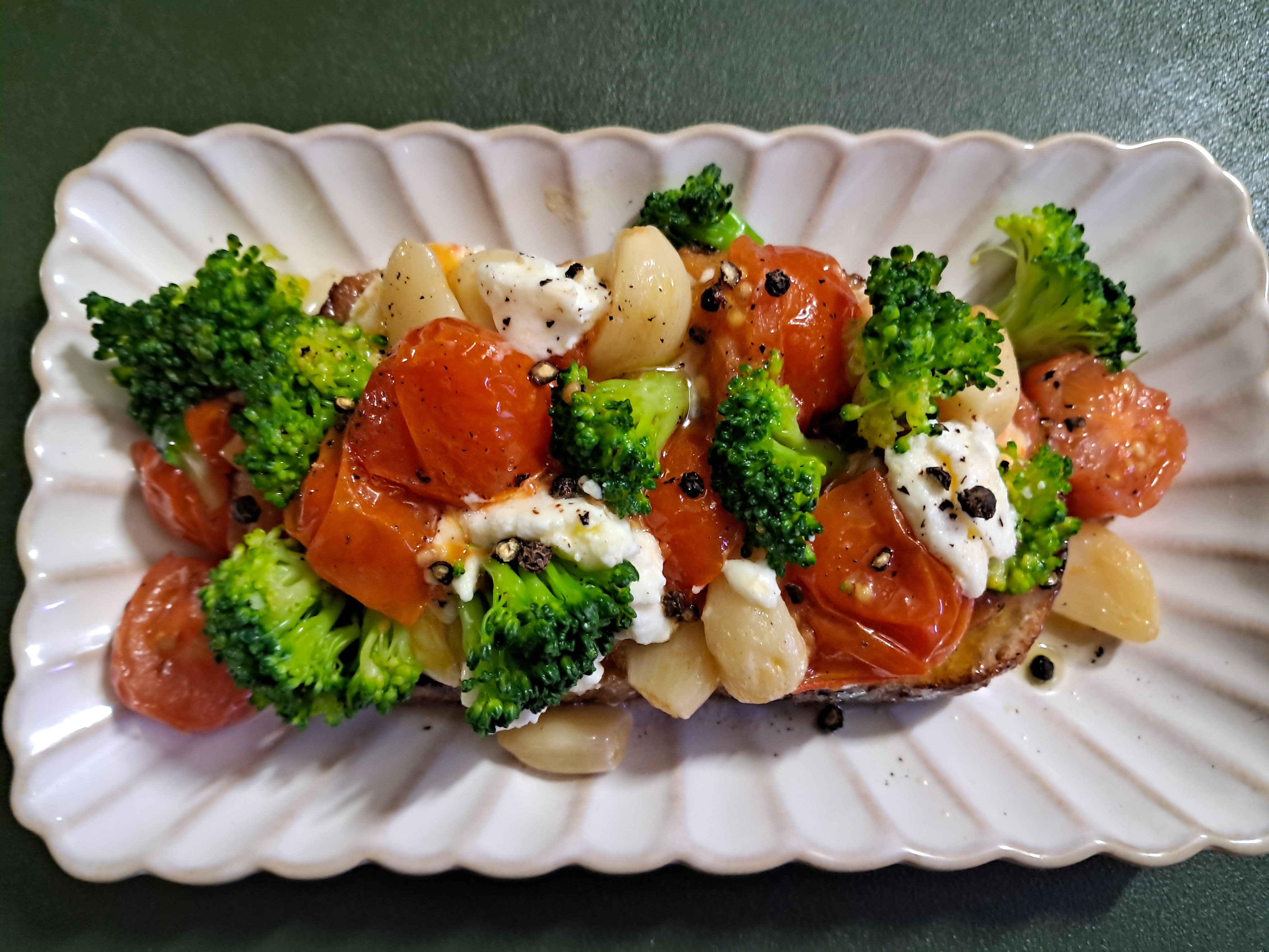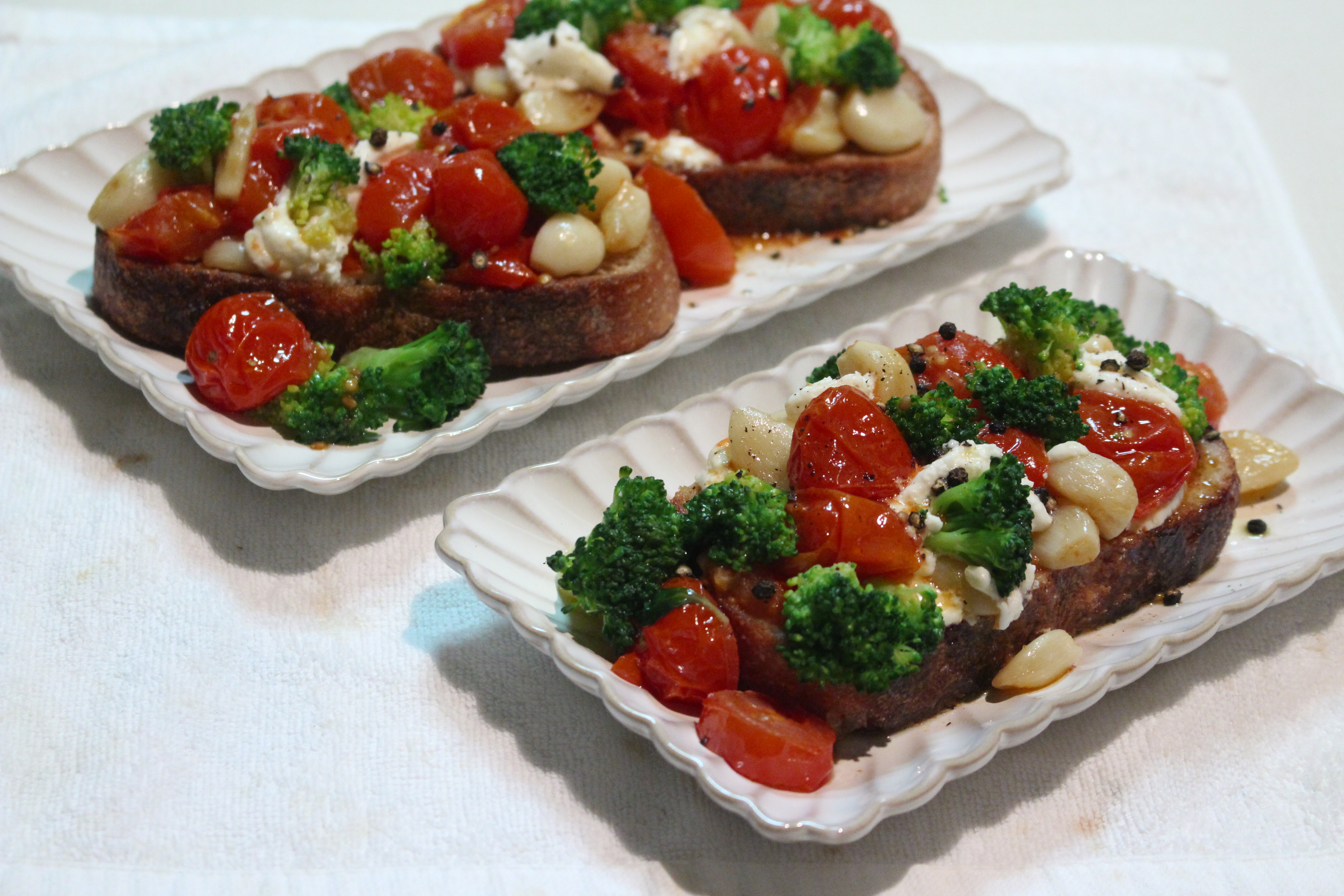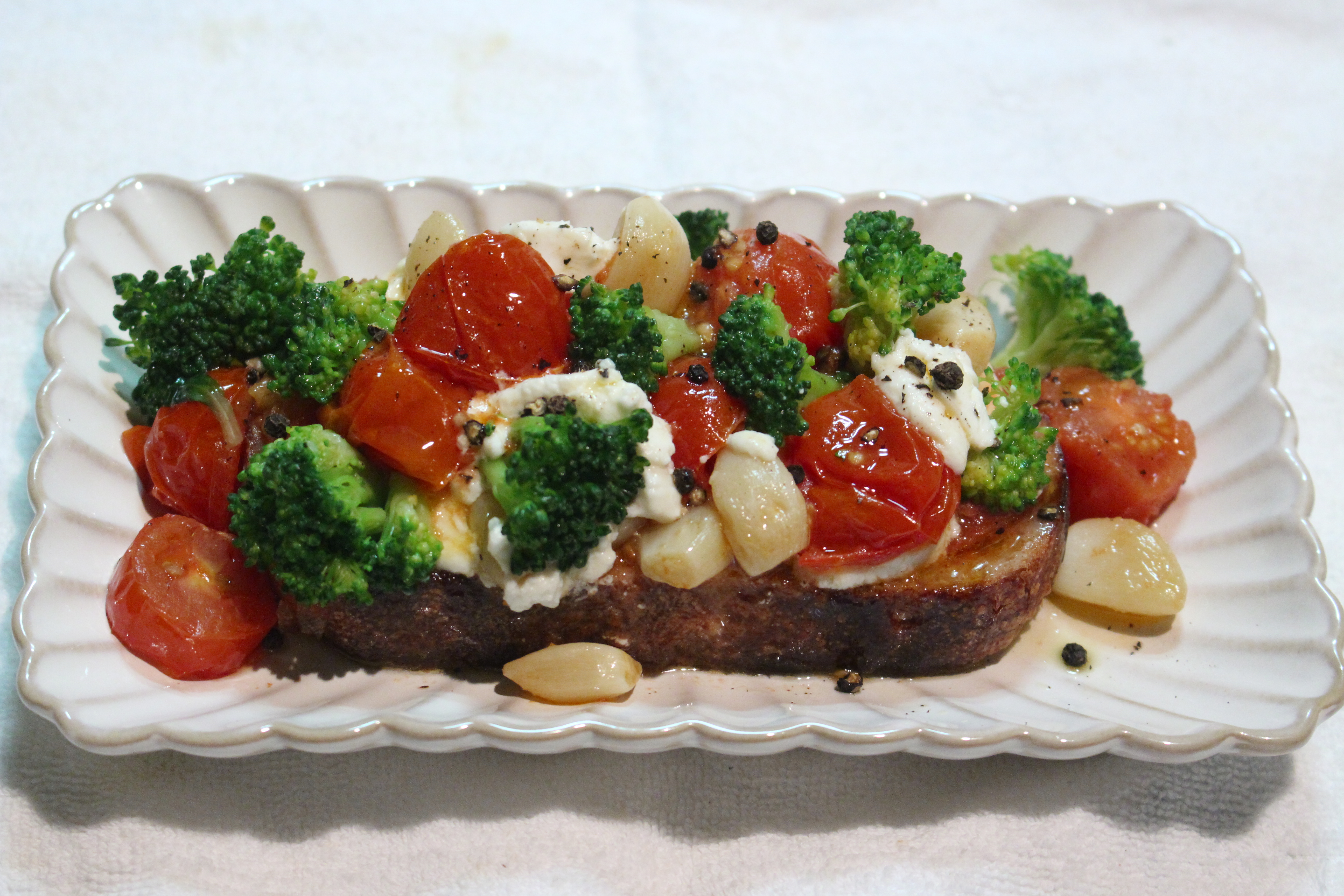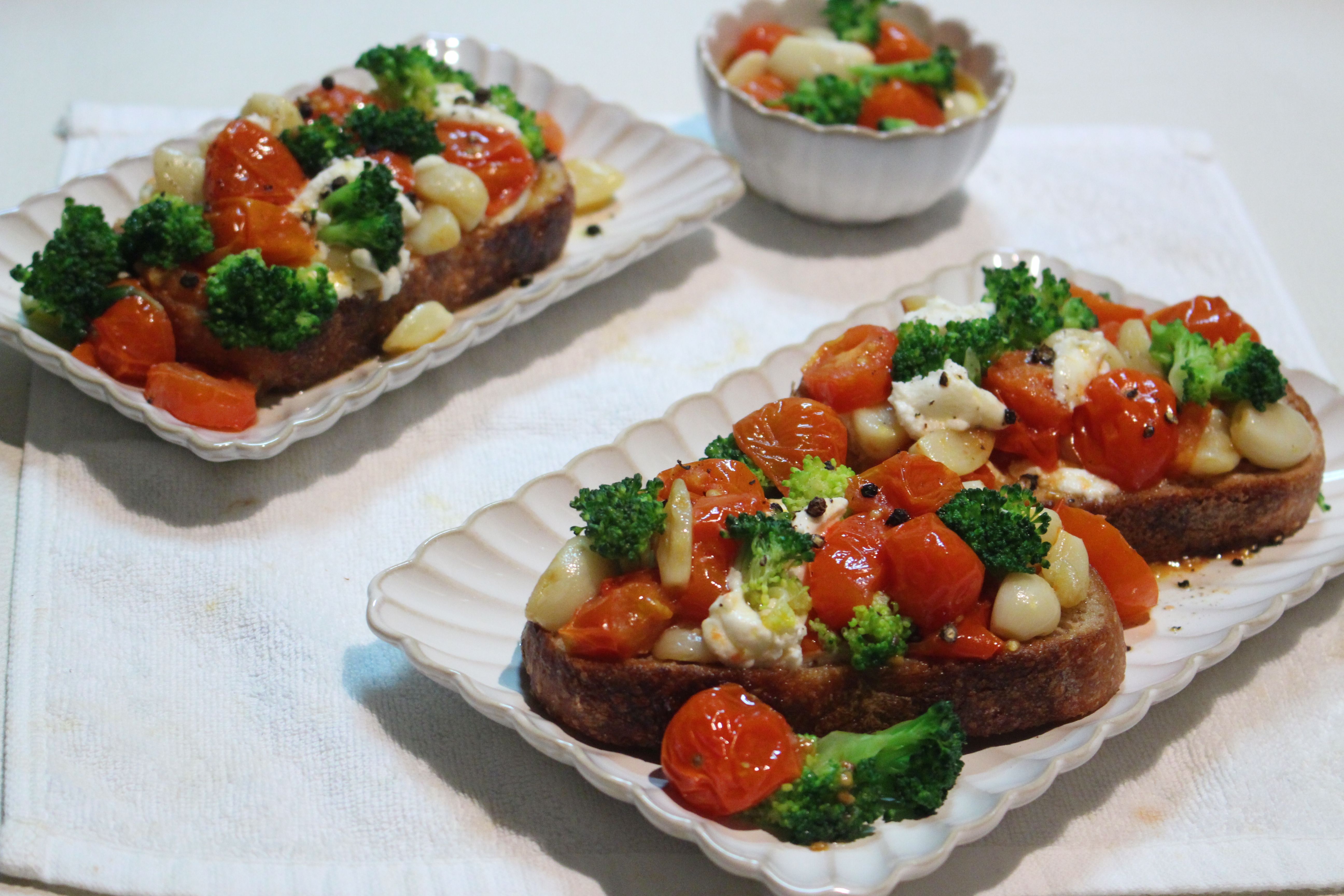 7. 6의 빵 위에 토마토, 마늘, 브로콜리를 올리고