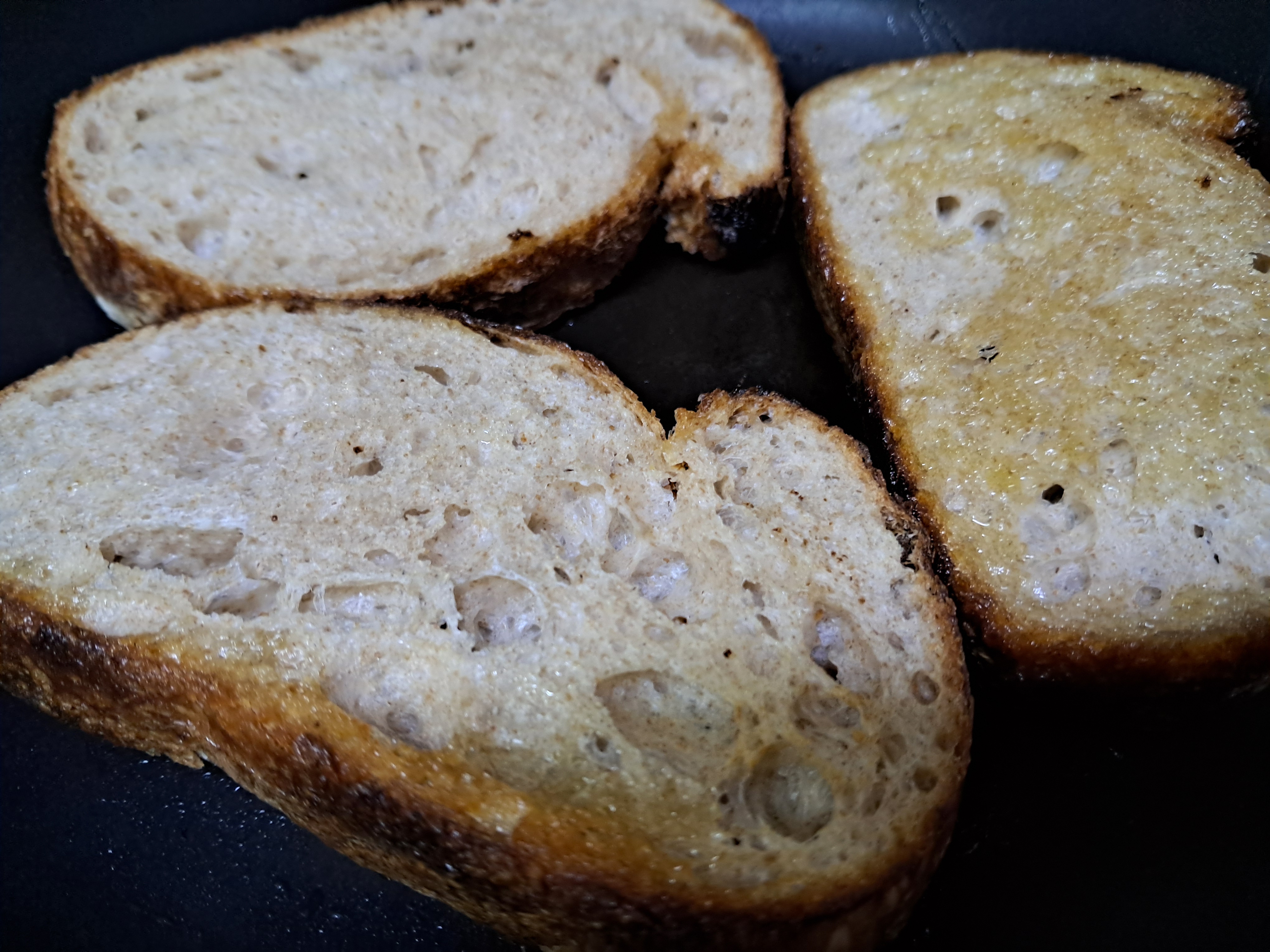 2. 올리브유를 두른 팬에 바게트 빵을 굽는다.
