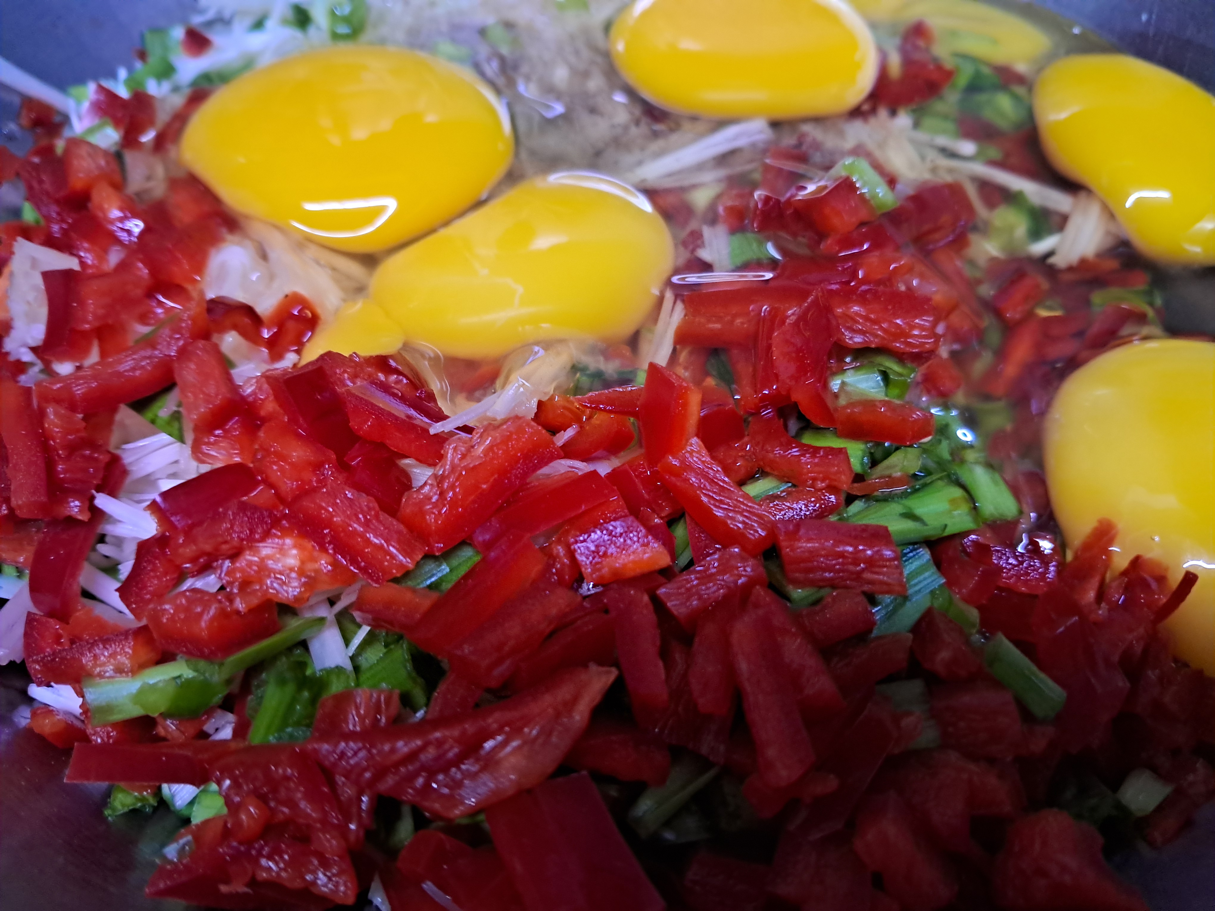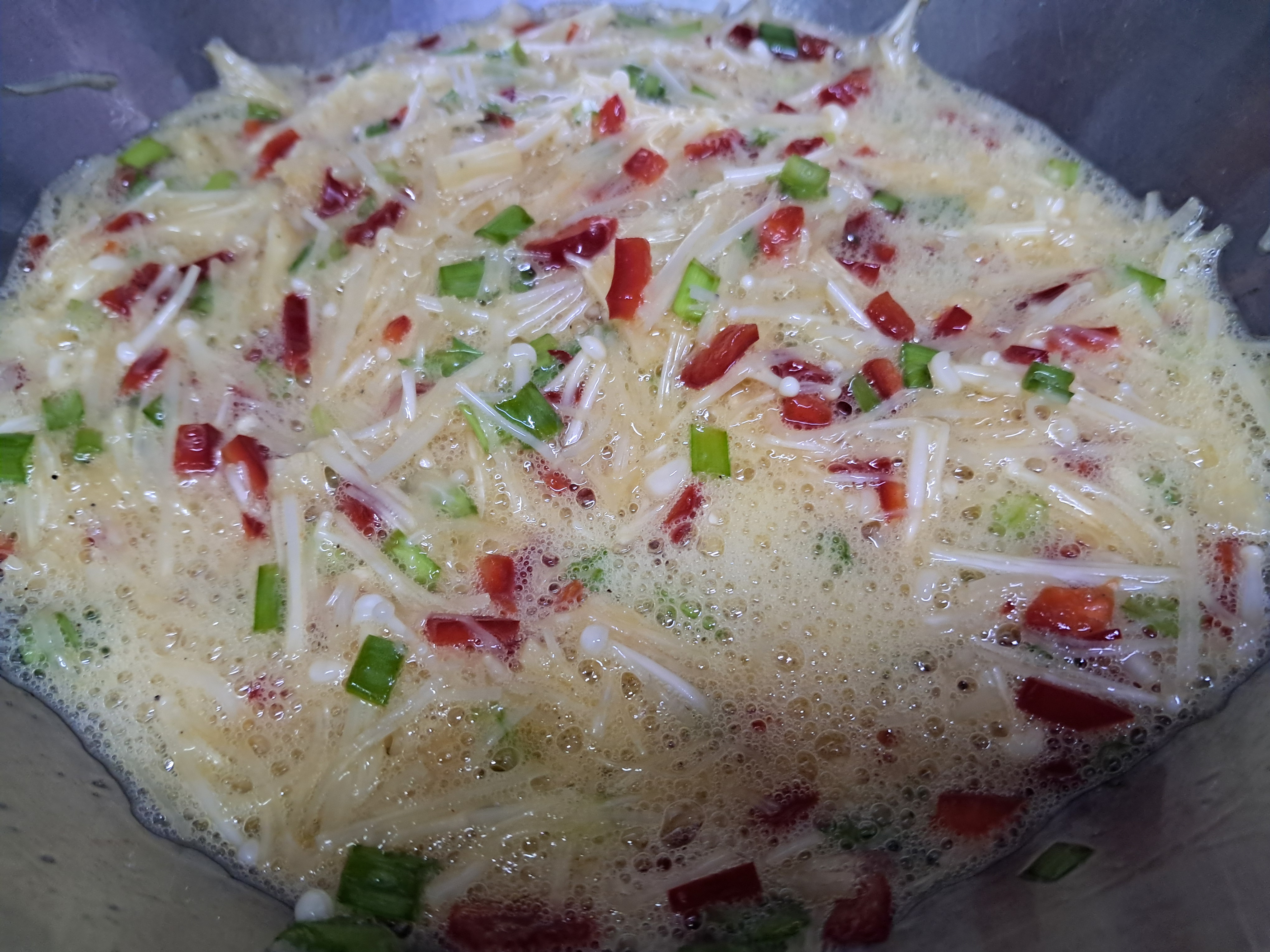 1. 볼에 달걀, 잘게 썬 송이, 팽이버섯,