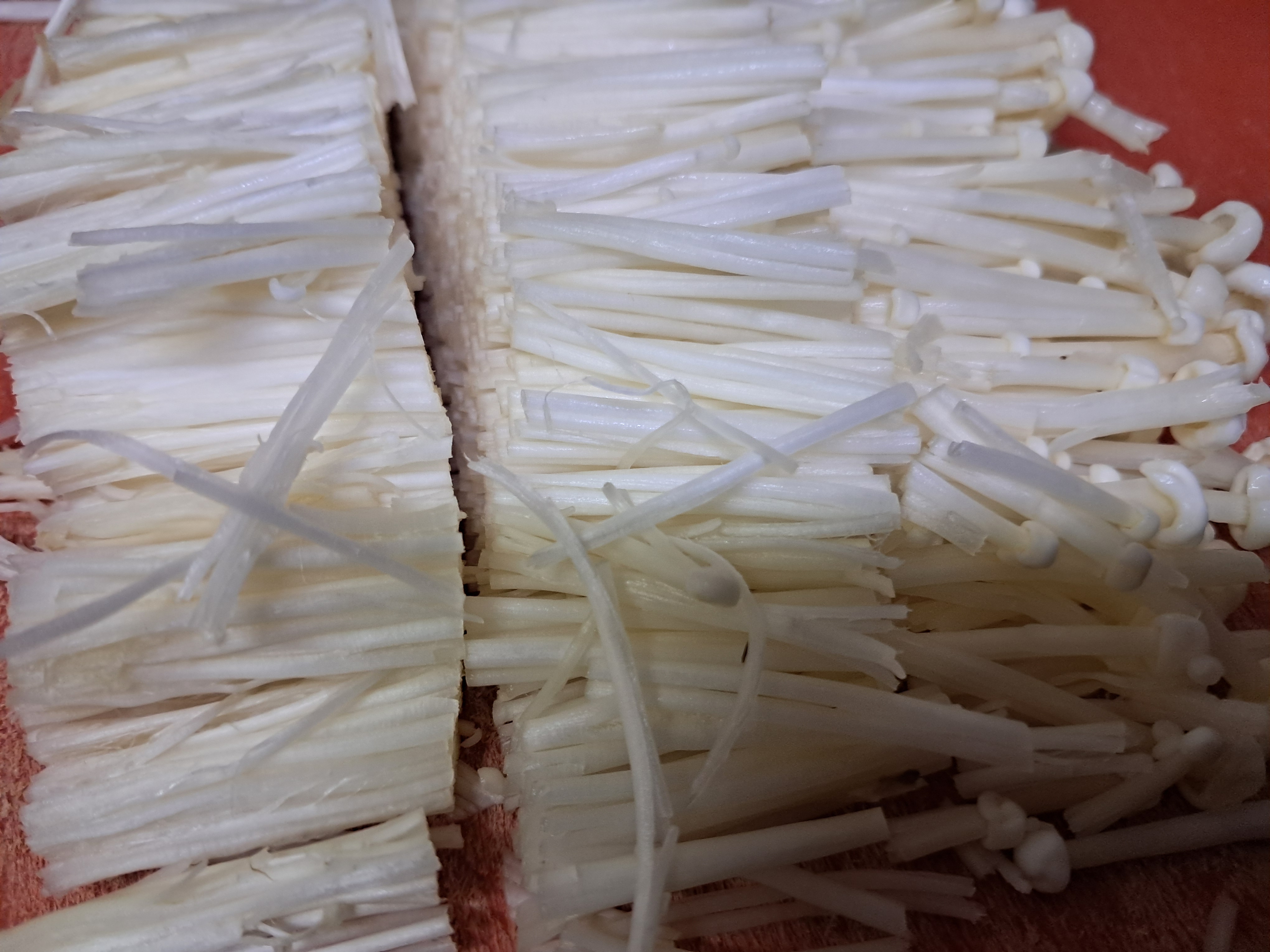 잘라낸 팽이버섯은 길이로 이등분한다.