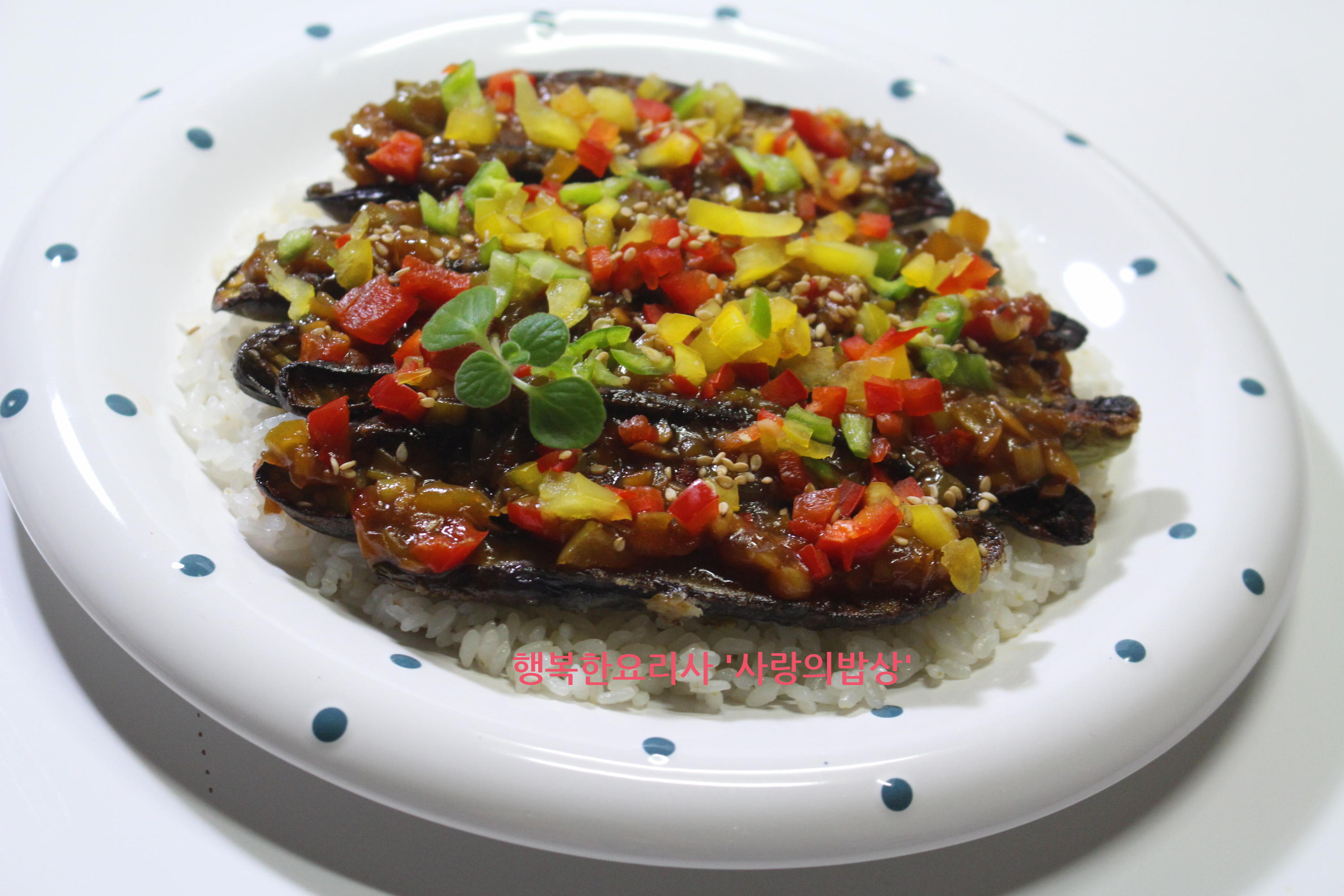 7. 밥위에 가지를 올리고 소스를 부어준다.