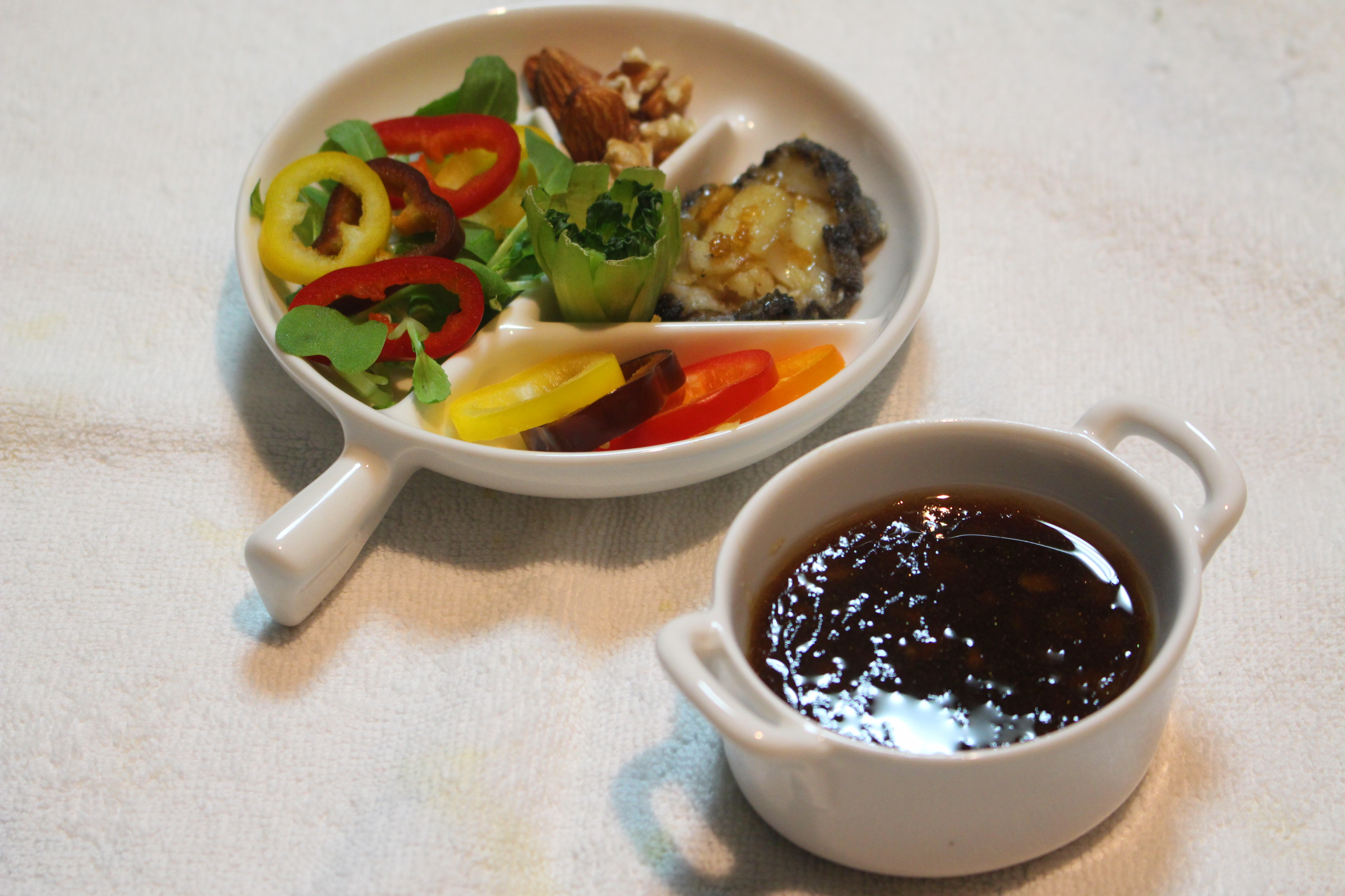 전복, 견과류를 올리고 소스를 곁들인다.